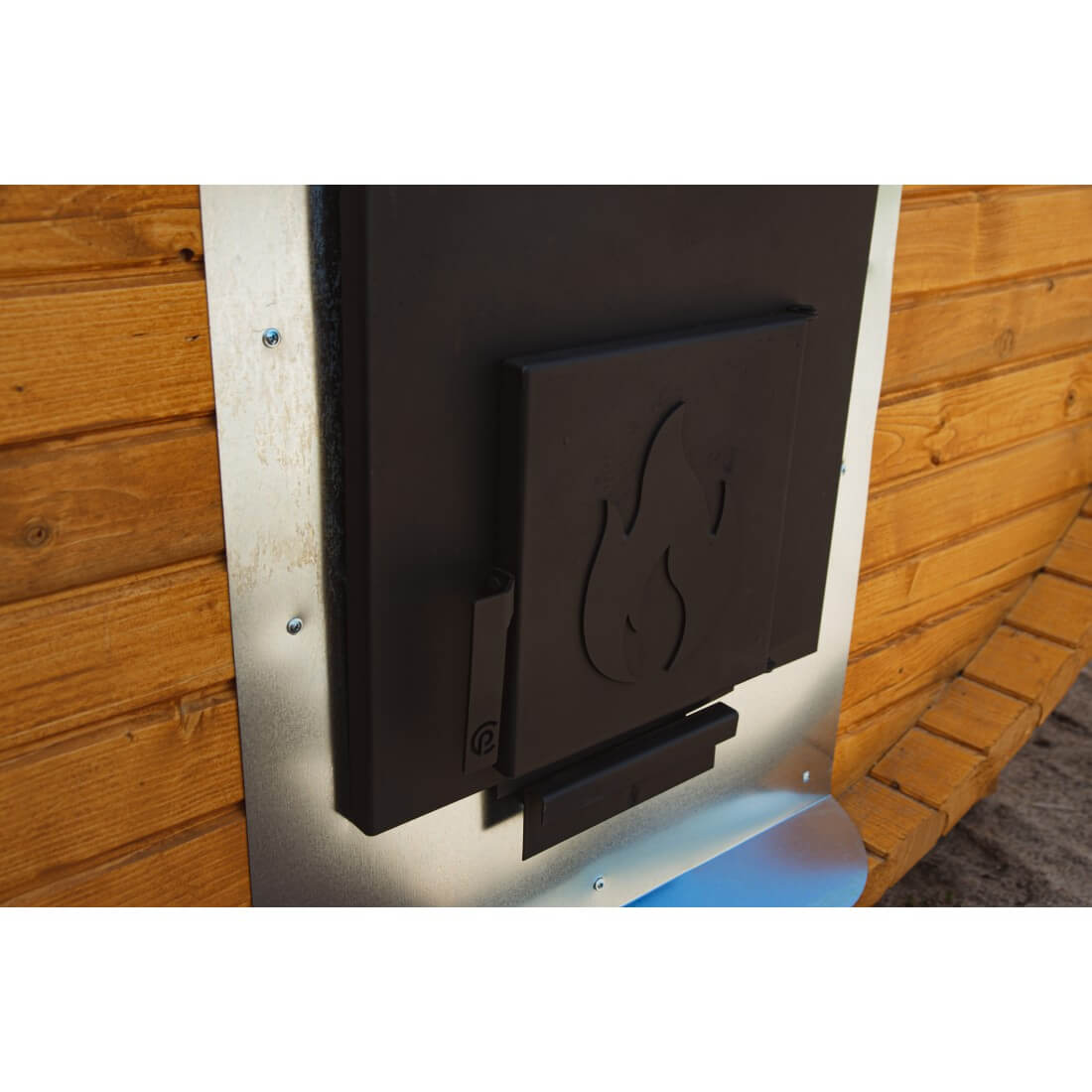 Эффективное отопление: стальная печь ComfortProm с баком из нержавеющей стали, дымоход и фиброцементная плита для защиты от перегрева.