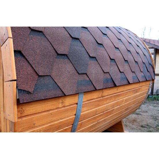 Эстетичный внешний вид и функциональность: глухая деревянная дверь, светильники внутри парной и у входа, а также красивая кровля из гибкой черепицы.