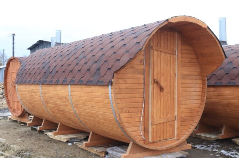 Баня-бочка с двумя помещениями — это удобная и практичная замена традиционным баням. Благодаря компактным размерам и малому весу, такую конструкцию легко разместить практически в любом углу участка, без необходимости строить капитальный фундамент.