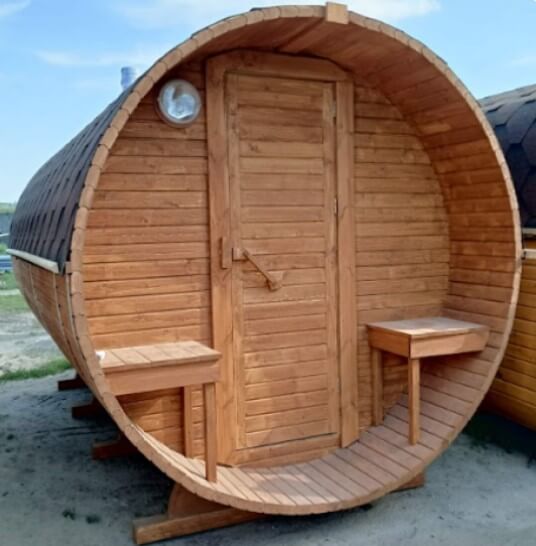 Этот тип бани-бочки с двумя комнатами предназначен для компании из 2–4 человек (например, четверо сидящих или двое лежащих).