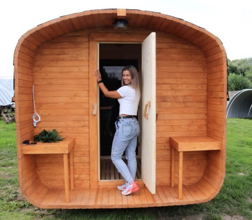 Для еще большего удобства можно заказать защитный козырек или небольшую террасу длиной около 0,5 метра — отличное место для отдыха после парной.
