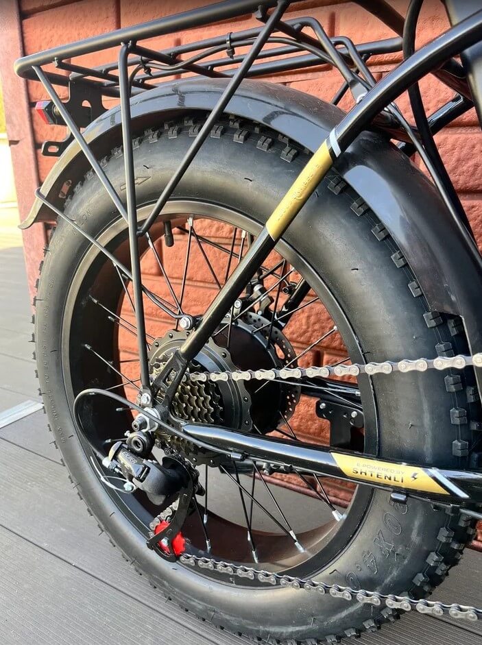 Электровелосипед оснащен колесами диаметром 20 дюймов. Мотоциклетная резина помогает амортизатору сделать езду более комфортной, также она с легкостью вытягивает электровелосипед из песка и грязи и делает езду безопаснее в гололед. Прямая посадка исключает быструю утомляемость рук, что делает прогулки на Shtenli Fatbike GTR сплошным удовольствием.